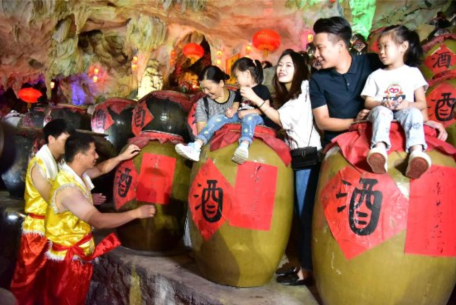9月21日,连州当地300多名瑶家人来到连州地下河举行一年一度的开坛仪式。连州地下河里藏了有3000多吨黄精糯米酒,整个岩洞堆满了大酒坛子。在开坛仪式结束后,有一家人走到游客品酒处,男主人从包里拿出5万元现金,告诉工作人员,他要订1000斤洞藏酒,专门给女儿出嫁时的酒宴上饮用,当成嫁妆送给女儿。他有2个女儿,1个今年5岁,1个今年3岁,他们是祖孙三代共一家六口专门来连州订酒的。