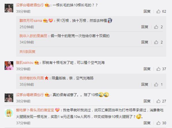 除此之外,亦有网友表示不解:“双汇集团当年为打市场早承诺过,消费者吃火腿肠发现一根毛发,奖励1万元还是10万元,咋变成赔偿10根火腿肠了?”