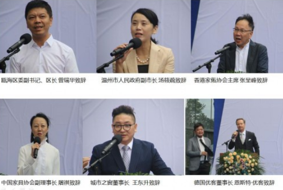 温州城市之窗”家具整装中心开业典礼上,瓯海区区长曾瑞华、温州市人民政府副市长汤筱疏、香港家私协会主席张呈峰致辞、德国優客董事長 恩斯特·優客、中国家具协会副理事长屠祺先后上台致辞,共同表达了对温州城市之窗家具整装中心未来发展的美好祝愿和一致肯定。