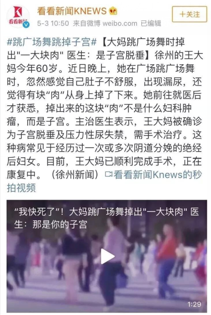 近日,一则【大妈跳广场舞时掉出"一大块肉" 医生:是子宫脱垂】的新闻出现在大众视野,原来这位大妈在跳广场舞时出现漏尿,还有一块“肉”从身上掉下来,吓坏众人!后经医生诊断为子宫脱垂及压力性尿失禁。