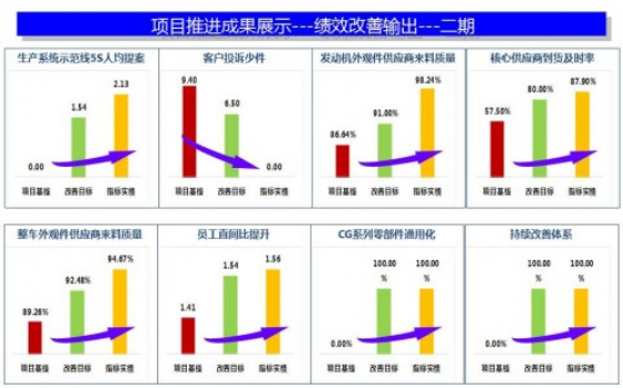 精益二期项目自2019年3月至今,取得喜人的成果。生产系统5S管理推进课题建立起公司的5S管理体系,人均提案数由原来0.045件/人/月提升到2.13件/人/月;客户投诉(少件)减少课题由9.4项/月减少到0项/月;发动机外观件(5家供应商)来料合格率提升课题来料合格率由改善前的86.64%提升到98.24%;核心供应商到件及时率提升课题到件及时率由57.6%提升到94.75%;整车外观件(5家供应商)来料合格率提升课题来料合格率由89.26%提升到94.47%;员工直间比提升课题员工直间比由1.4:1提升到1.56:1;CG车型系列车型零部件通用化课题与构建精益持续改善人才培养和认证体系课题也顺利完成