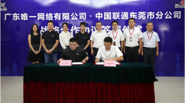 2019年9月29日,广东唯一网络科技有限公司(以下称“唯一网络”)与中国联合网络通信集团有限公司东莞分公司(以下称“东莞联通”)在新时空联通大厦签署了战略合作框架协议。东莞联通党委书记、总经理胡卫红、东莞联通副总经理林颖、东莞联通政企客户事业部副总经理钟荣威、广东联通产业互联网公司东莞办事处主任林文彬、唯一网络董事长王宇杰、唯一网络副总裁蔡湛、唯一网络副总裁马凤军、唯一网络副总裁易志强等相关领导出席了签约仪式。