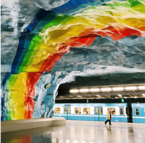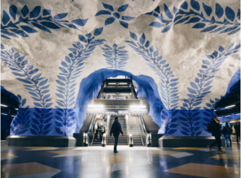 而辗转于城市地下交通,在岩石间开凿建造的地铁会再一次冲击着你对斯京的想象。T-Centralen这条处于城市中心、集结3条线路的地铁站极大程度地保留了天然的岩石峭壁,艺术家们可以尽情在岩壁上诠释着“妙笔生花”的含义:蓝白相间的颜料以及简单的花朵和蔓藤图案,向乘客们传达着来自于大自然的宁静力量,消除因奔波而产生的焦躁不安的情绪。在这座斯京最忙碌的地铁站里,穿梭换乘也变成了一场“艺术巡礼”,而事实上这充满设计感的地铁站只是“常规设置”,在斯京的100个地铁站里你可以欣赏到成百上千位艺术家的作品,因此它才有底气号称是“世界上最长的艺术博物馆”。