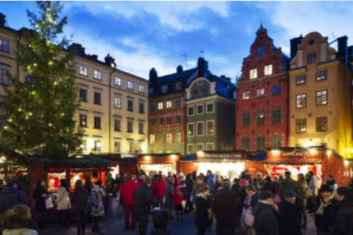 每年11月底,老城广场上开始举办圣诞集市。北欧冬季下午四点多,天色已经昏暗,老城广场被圣诞灯火点亮,前来购物的人熙熙攘攘。在这里,手工自制的圣诞温红酒、传统圣诞甜点姜饼、小精灵玩偶、松针花环等各式传统的圣诞用品琳琅满目,在北欧漫长的黑夜里给人们带来温情的圣诞氛围。