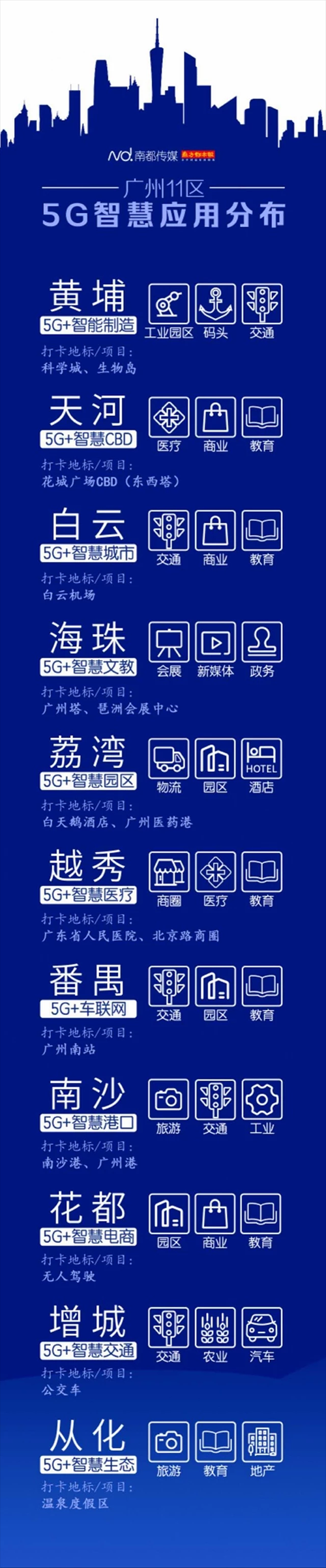 报告显示,作为5建设重镇的广州,首期5G基站建设的投入已经达到100亿,最新的规划显示,到今年年底广州要建成2万座基站,全国领先。按照规划,广州将全市11区进行5G功能细分,各有定位和主题:黄埔(5G+智能制造)、天河(5G+智慧CBD)、白云(5G+智慧城市)、海珠(5G+智慧文教)、荔湾(5G+智慧园区)、越秀(5G+智慧医疗)、番禺(5G+车联网)、南沙(5G+智慧港口)、花都(5G+智慧电商)、增城(5G+智慧交通)、从化(5G+智慧生态)。而在5G重点布局区域,天河、海珠、越秀、番禺等地的基站落地数量都已超过1000座。