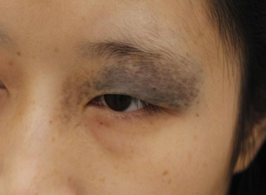 首先,我们先来了解一下太田痣。太田痣又称上腭部褐青色痣、眼皮肤黑素细胞增生病,是一种可能与遗传有关的常染色体显性遗传。根据国家卫健委权威医学科普项目传播网络平台提供的资料显示,太田痣好发于有色人种,女性多见,一般长在一侧面部,最常见于眼眶、面部周围等。太田痣大多是数厘米大小的灰蓝色、青灰色、灰褐色、紫色斑块,色斑颜色还常随年龄的增长而加深。如上图所示,小严的右边眉眼处有一片较为明显的太田痣痕迹。