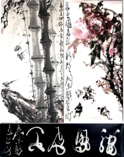 纵观他的作品,不管是雄鸡仙鹤、紫藤花卉、还是劲竹飞鸟,无不把几十年来伴随绘画过程中深研的书法之笔融入到绘画之中,得心应手的中锋、逆锋、侧锋用笔,让画面金石十足而又富有张力,筋骨俱老,气象峥嵘,构图块面结合,体积感极强,笔融于纸的深入雄强而不失隽美、朴拙而不失灵动、古意而不失今貌。