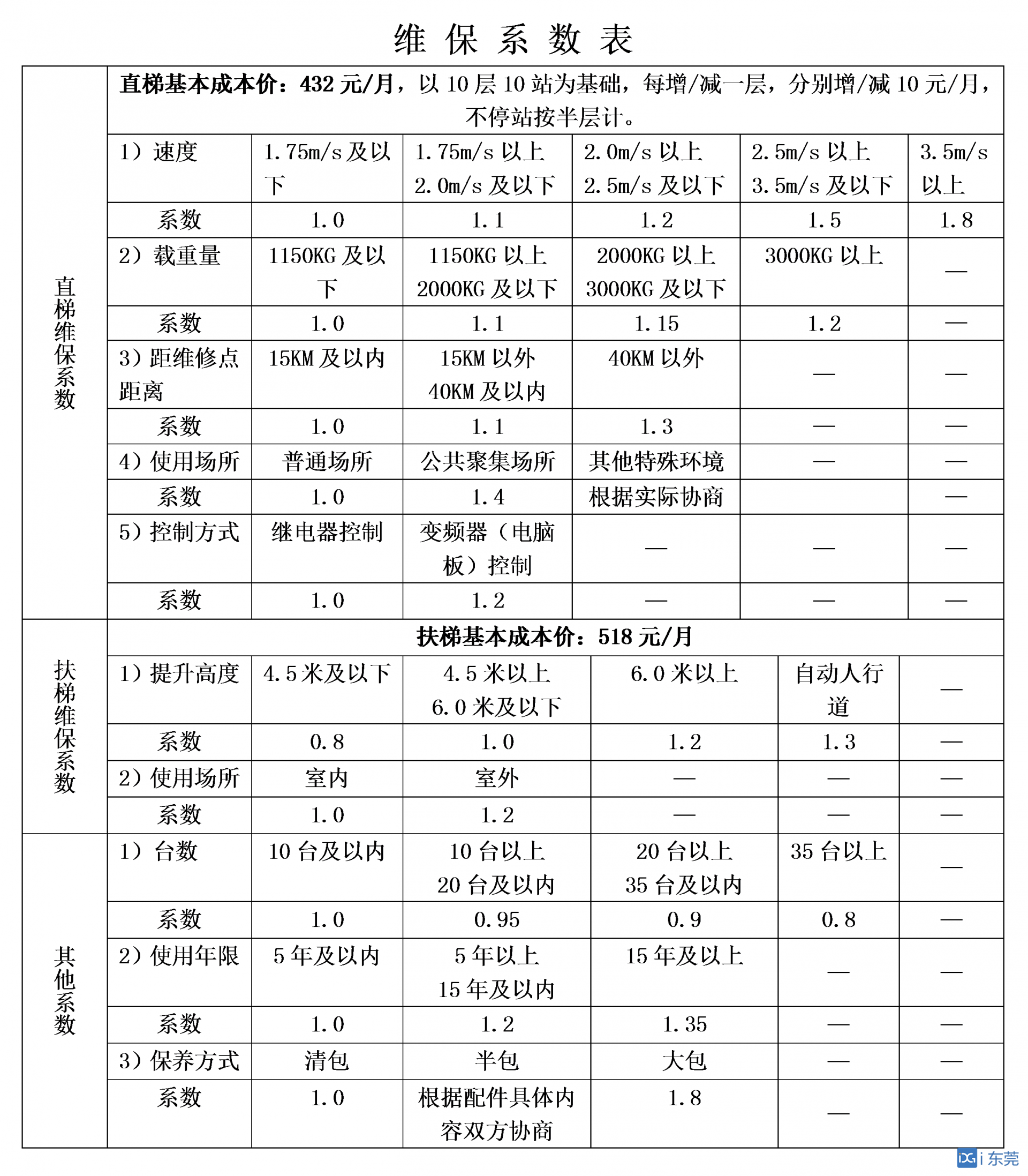 该文件指出,目前我市每台曳引与强制驱动电梯(即直梯)的维保基本成本价按照10层10站的基准,维保费用约为每月432元。每增减一层,费用就增减10元每月。再按照直梯运行速度、载重量和使用场所等不同的条件,乘以相应的系数来获得具体直梯的维保成本。