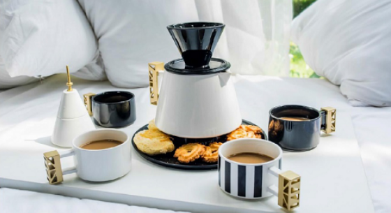 和《流浪地球》联名出品火箭手冲咖啡具套装,上下堆叠的火箭造型,化整为零,九项合一。既是生活实用器,又是空间装饰物。