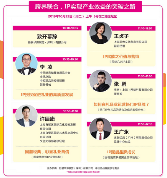 本次论坛活动邀请了中国玩具和婴童用品协会副秘书长李凌先生,一起探讨IP授权与礼品业的开发;现场将围绕国家博物馆及几米IP进行主题分享;同时还有成功运营小黄人IP的上海宝客、时下大热漫威联名黑金店的名创优品进行实例分享。