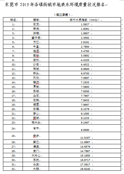 东莞市第三季度各镇街城市地表水环境质量状况排名出炉