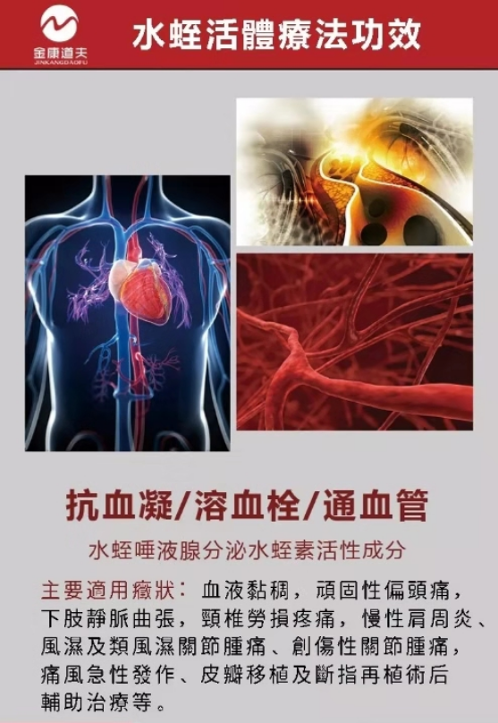 香港金康道夫所用的活体水蛭,都是医用级水蛭,而且都是水蛭素含量很高的菲牛蛭。对医用级菲牛蛭经过四重严格过滤,隔绝所有的重金属和农药残留,所有活体都是一次性使用,卫生安全。在活体治疗过程中,工作人员把医用水蛭置于特定部位,简单直接且水蛭素活性更强,配合服用水蛭素胶囊,就能达到事半功倍的效果。