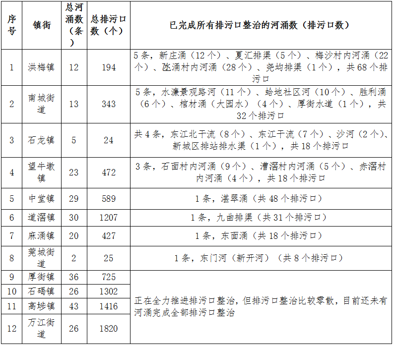 核查发现,洪梅、南城、石龙、望牛墩、中堂、道滘、麻涌、莞城等8个镇街已完成排污口整治的河涌均无污水溢流,整治效果良好;厚街、石碣、高埗、万江等4个镇街排污口整治工作正全力推进,预计11月中旬能够完成部分河涌的排污口整治工作。(来源:i东莞)