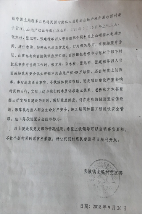 后来,记者第二次采访之后,龙礤村书记张河平为了张才木的个人利益,不顾村民的合法权益,伙同一些部门人员在官陂镇民政所(原龙礤村村书记张增添)的办公室,整理一份是非不分,颠倒真实情况的说明,本来要让村长盖章,但村长认为情况不属实就拒绝了盖章,2018年9月26日村党支部的张河平盖上党支部的章。