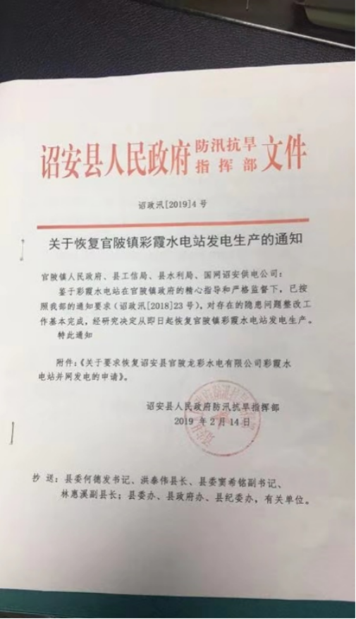 后来,新闻媒体第三次曝光之后,才有一些部门于2018年12月18日到施工现场检查,发现了很多问题,并责令张才木停水停电必须整改,但张才木财大气粗,活动能力强大,不到两个月的时间,在没有任何整改的情况下,诏安县防汛抗旱指挥部于2019年2月14日又发布了让其放水发电的通知!
