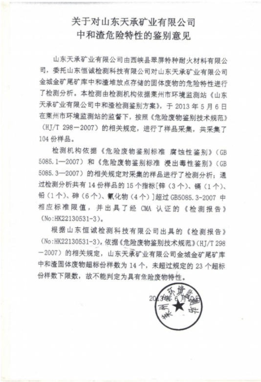 山东天承矿业有限公司中和渣危险特性的鉴别意见》。