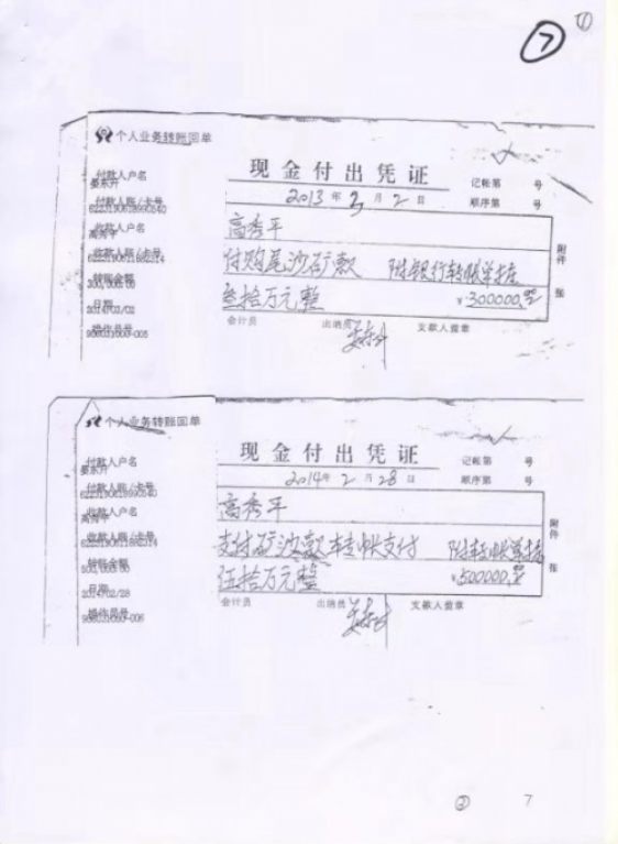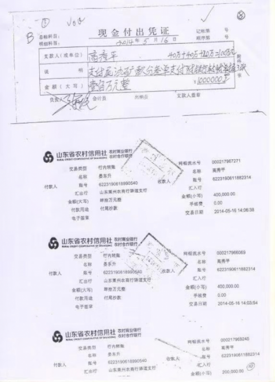 通过确认后,江信实业公司便与莱州驿道镇一石材加工厂签订了场地租赁合同,将来用于该“中和渣”固体废物的存放。2月19日江信实业公司与鲁某峰正式谈“中和渣”收购事宜,定价每吨为100元,每拉运1万吨结算一次。款打到高某平账户上,然后再由高某平转给鲁某峰等人。其中转给张某平380万元,鲁某峰320万元,高某平留运费400万元。(下图为打给高某平的部分转款记录)