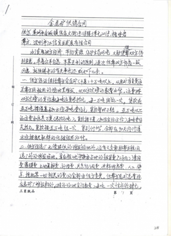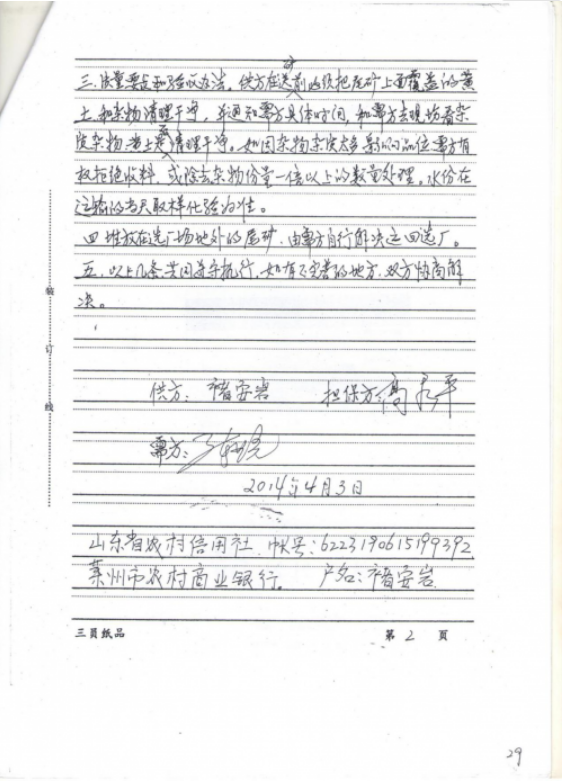 当时在场人员有宋某标、褚某岩、鲁某峰、高某平等。因褚某岩是山东黄金焦家金矿保卫科在职干部,与天承矿业尾矿库负责人熟悉,约定由他负责运输,租赁堆放场地,每吨30元。并于2014年4月3日,补签了供货合同,担保人为高某平。