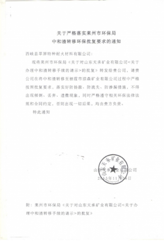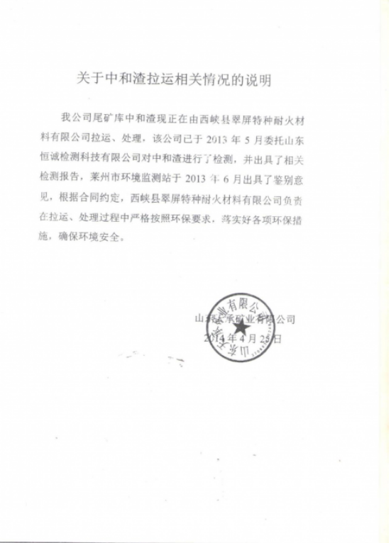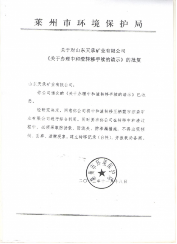 鲁某峰当时便给出具了莱州市环保局两个批文,分别是《山东天承矿业有限公司中和渣检测鉴别方案》和《关于对