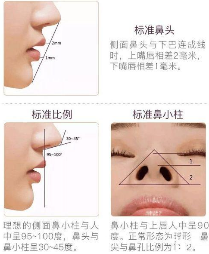 理想的侧面鼻小柱与人中呈95~100度,鼻头与鼻小柱呈30~45度。