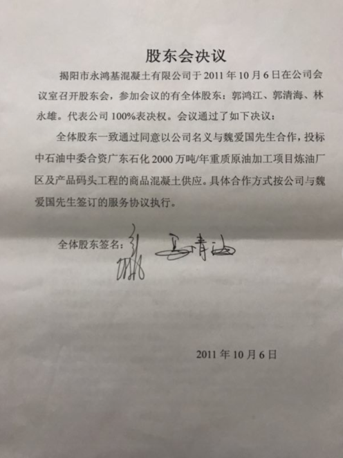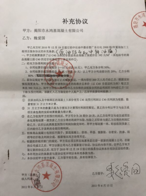 当年在魏先生努力下,揭阳市永鸿基混凝土有限公司成为一匹黑马,打败众多业内企业而中标,并于2011年6月30日在北京与甲方中国天然气股份有限公司广东石化分公司签订混凝土采购框架协议。但两年后这份合同的乙方(卖方)却变更了,变成了揭阳市中委鸿基混凝土有限公司。