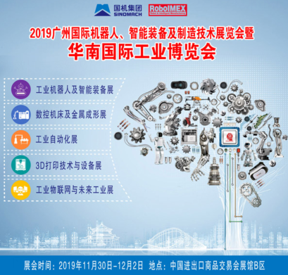 由中国机械工业集团有限公司(国机集团)主办,广东省人民政府、广州市政府重点支持,广州市工业和信息化委员会组织,中国机械国际合作股份有限公司、国机智能科技有限公司、中国电器科学技术研究院有限公司联合承办的“2019中国(广州)国际机器人、智能装备及制造技术展览会暨华南国际工业博览会”(以下简称华南工博会)将于2019年11月30日-12月2日在广州中国进出口商品交易会展馆举办。