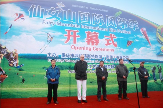 开幕式上,来自德国的国际风联副主席汉斯(Hans)一口流利的中文致辞赢得了广大游客的一片叫好,他赞美仙女山的美丽,并感谢风筝为世界人民架起了友谊的桥梁。这场风筝盛会,他为我们广大游客带来了寓意中德友谊长存的长串风筝。