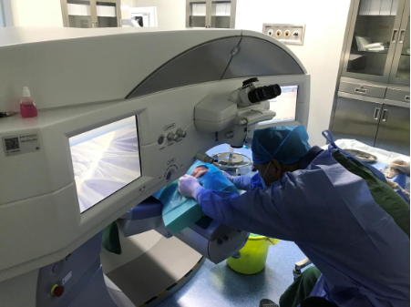 到了手术室,把身上东西全部交给家属,进去换手术服,进入手术室,躺下,滴麻药,这之前都很正常,没任何不舒服。接下来,手术眼睛要滴眼药水进行消毒,医生提前说有点刺激性,不是有点,是很刺痛的感觉,紧紧闭着眼睛,还好大概三分钟就感觉好多了,接下来用手术布蒙住了我整个脸,在眼睛上贴了一块胶带,用剪刀把眼睛那条缝剪开,露出了眼睛,然后用橡胶圈撑住眼眶,打开手术灯,手术灯很亮很亮,是我见过最强的光线,开始根本无法直视,后面朝眼睛里滴了大量眼药水,隔着水才可以直视,这灯光盯久了会觉得视线里从一片白茫茫变成镀着金光的黑漆漆的一片,陷入一种不真实的幻境,有做梦的感觉。
