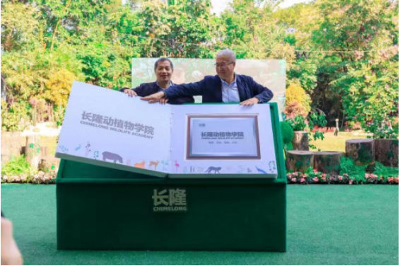 (图片说明:中国野生动物保护协会李青文副会长兼秘书长与长隆集团副总裁兼集团首席动植物官董贵信为长隆动植物学院揭牌)
