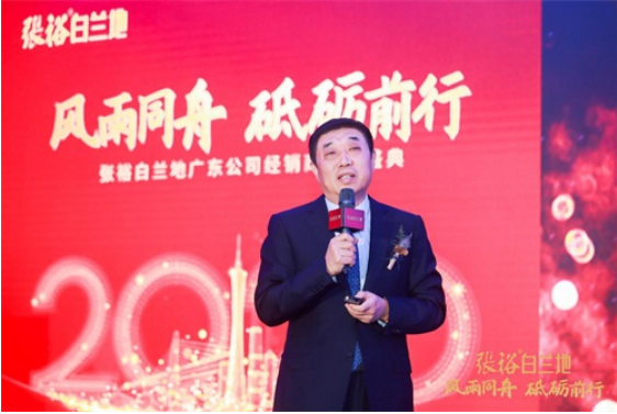 鼓舞表演后,张裕广东白兰地营销管理公司总经理王洪山分享了工作报告,并对新一年提出了三个关键词:自信、韧性、改变。王总引用了周洪江董事长的话激烈大家:“志不求易者成,事不避难者进。”