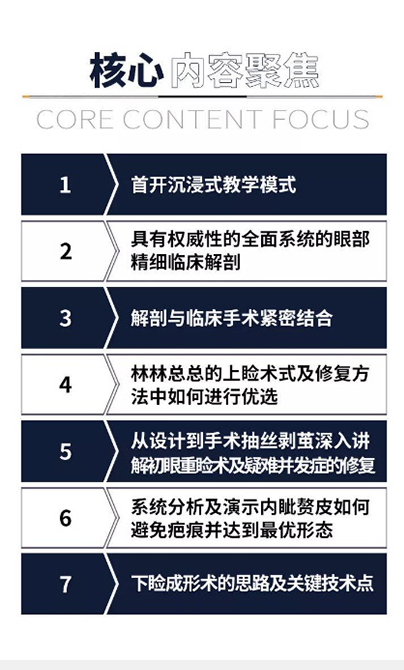 这一届眼整形研习班,将继续秉承丽格学院的传统,深度解析手术关键点。届时联合丽格第一医疗美容医院业务院长邢新教授、首届金刀奖得主张诚院长、刘志刚院长、解剖权威杨超教授、眼整形专家吴焱秋教授和王岩主任,将携手上演眼整形手术精粹盛宴。