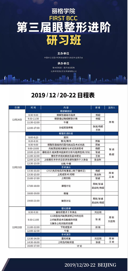 由中国非公医疗机构协会整形与美容专业委员会主办,北京联合丽格第一医疗美容医院和北京希言思创文化传媒有限公司承办的丽格学院第三届眼整形进阶研习班,将于2019年12月20-22日在北京举办。