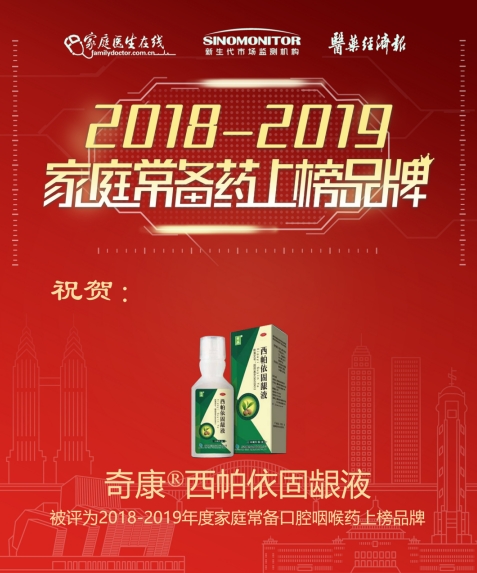 2019年12月5日,“2018-2019家庭常备药上榜品牌”榜单公示大会暨颁奖典礼在重庆隆重举办。 由商会副会长单位——新奇康药业股份有限公司生产的西帕依固龈液以独特的配方、安全确切的疗效,深受广大患者的一致好评,荣获“2018-2019家庭常备药上榜品牌”(口腔咽喉药)的荣誉!
