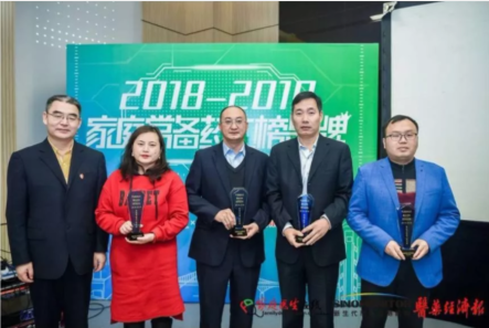 ▲新奇康代表接受“家庭常备药上榜品牌”颁发西帕依固龈液荣誉奖杯(左四)