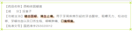 西帕依固龈液主要成分没食子,又名春虫秋果,具有健齿固龈、清血止痛之功效,可用于牙周疾病引起的牙齿酸软、咀嚼无力、松动移位、牙龈出血、口舌生疮、咽喉肿痛、口臭烟臭等。