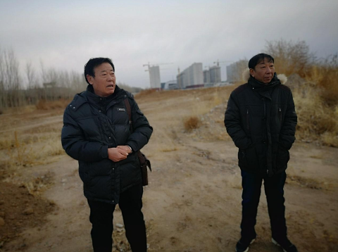 (失地农民周云和董海波站在自己已经被征收且荒废的土地上,讲述失地十年的艰辛路)