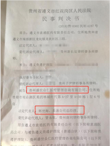值得注意的是,修文中医院因托管造成的纠纷不是个案,据悉,位于贵州省遵义市的遵义贵遵护理院同样遭受过这样的事,同样是以郭世海为法人的贵州盛世众仁医疗管理咨询有限公司,以同样的手段签订托管协议获得公章和营业执照,在托管期间购置药款未支付被遵义一医药公司于2018年告上法庭。