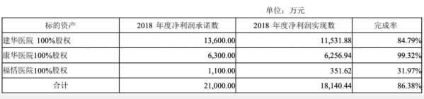收购时,双方签了对赌协议,建华医院管理层承诺2016年、2017年、2018年实现净利润分别不低于1.05亿元、1.23亿元、1.36亿元。若没能实现承诺业绩,则由康瀚投资向上市公司支付补偿,并且优先以上市公司股份补偿,不足再补现金。