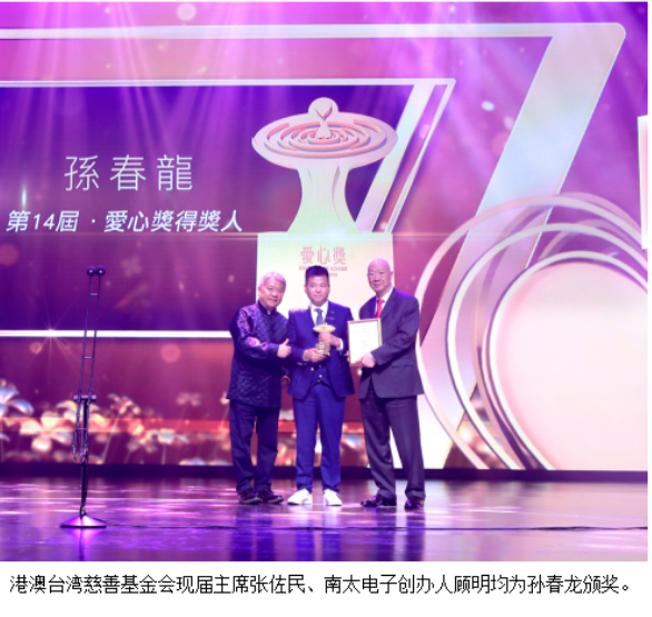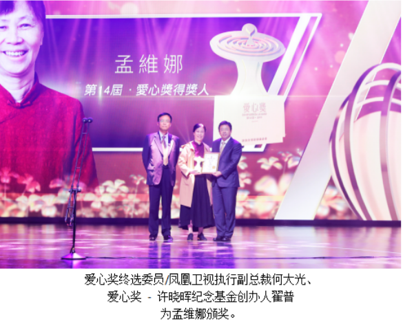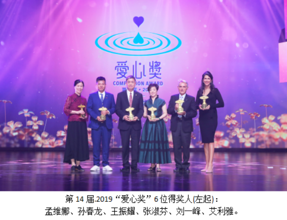 港澳台湾慈善基金会爱心奖主办、凤凰卫视协办及制作播出、北京东西方慈善论坛及台湾现代财经基金会协办的第14届.2019爱心奖颁奖典礼,12月18日(星期三)晚在香港湾仔会议展览中心3B展览厅盛大举行,中国内地的王振耀、孟维娜、孙春龙;中国台湾地区的张淑芬、刘一峰;中国香港地区的艾利雅,因为他们长年为公益付出全副心血、慷慨助人无数,被甄选为本届爱心奖得主,每人各获颁14万美元奖金,全额用于公益事业,泽被更多有需要的弱势社群。