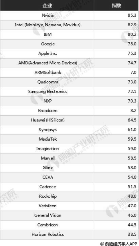 近年来,各类势力均在发力AI芯片,参与者包括传统芯片设计、IT厂商、技术公司、互联网以及初创企业等,产品覆盖了CPU、GPU、FPGA、ASIC等。在市场调研机构Compass Intelligence2018年发布的AIChipset Index TOP24榜单中,前十依然是欧美韩日企业,国内芯片企业如华为海思、联发科、Imagination(2017年被中国资本收购)、寒武纪、地平线机器人等企业进入该榜单,其中华为海思排12位,寒武纪排23位,地平线机器人排24位。