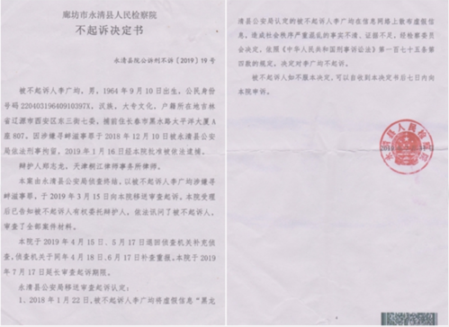 李广军回忆说:接下来的几次提审,警方还是如法炮制,但是提审他的经常是新面孔,有的警察(或协警)甚至明确告诉李:“你这个破案子没人爱管!”“我们只是帮忙的!”就这样一天天的熬,李终于熬过了两次补充侦查。卷宗到检察院后,律师认真研究过卷宗并亲往东北调查后,最终认定李是无罪的,警方指控李发布虚假信息扰乱社会秩序(即寻衅滋事)的证据根本就不存在。之后,一份加盖了律师事务所公章的律师意见被送到了永清县检察院检察长和办案人手中。永清县检察院先是做出了延期审查起诉的决定,之后又认真听取了律师意见并提审了李广军。2019年7月31日,永清县人民检察院做出不起诉决定书(永清县院公诉不诉{2019}19号),“认为永清县公安局认定的被不起诉人李广均在信息网络上散布虚假信息,造成社会秩序严重混乱的事实不清、证据不足,依照《中华人民共和国刑事诉讼法》第一百七十五条第四款的规定,决定对李广均不起诉。”至此,在经历了长达八个多月的摧残后,李广均终于走出大牢。