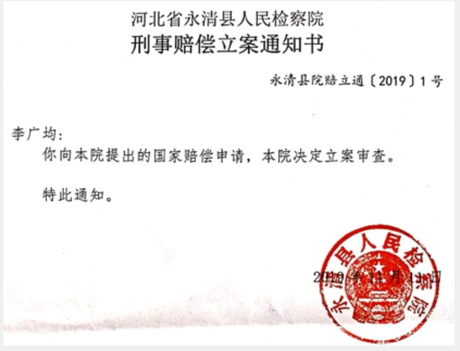 据悉,李广军重新获得自由后,于2019年8月18日按照法定程序向永清县检察院提出国家赔偿申请,检察院于10月未通知李已经立案受理,并于11月11日做出《刑事赔偿立案通知书》(永清院陪立通{2019}1号)。但是,在给李邮寄《刑事赔偿立案通知书》时,却因为李留的地址不详未能送达被退回。