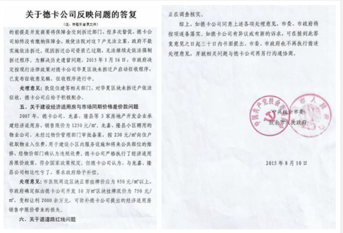 政府一方的说法立即招致德卡公司的强力反驳:为什么被上诉人矢口否认?因为此文件批的内容根本没有“经济适用房”字样。但是,被上诉人在二审提供的《扶余县发展和改革局文件》扶发改发【2010】73号关于隆昌花园却有“经济适用房”字样,我们怀疑这份文件是为了应对这次诉讼在开庭前伪造的,用这个带有“经济适用房”字样的所谓文件,应付德卡公司,以便证明给德卡限价是正确的,不用补偿(详见一审德卡公司提供的证据:由政府提交人大通过的扶人常发【2007】5号文件)。政府一方提交的证据证明:隆昌家园棚户区改造占地面积是99418平方米,扶人常发【2007】5号文件在2007年3月30日通过;但被上诉人二审提交的扶发改发【2010】73号关于隆昌花园占地面积同样是99418平米,却有“经济适用房”字样(见贴图1、2),可他们卖的价格每平方米是3000多元,又说庭后向法庭提交相关证据德卡公司害怕:难道又想造假?)……(很显然,政府提交的所谓文件前后矛盾,肯定有假。