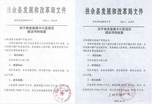 德卡公司随即向法庭补充三份证据,均为扶发改发[2007]47号文件加盖扶余市规划处及档案馆印章的文件,可以证明扶发改发[2007]47号文件真实存在,并称该份文件是扶余发改局下发给德卡公司的。这时,被上诉人又称:“对三份证据的真实性庭后核对(德卡公司对媒体说,是不是回去找部门商讨又要造假?),同时该文件系发展和改革局文件,上诉人提交的证据上加盖了规划管理处和城建档案馆的公章,并不能证明该文件真实性,该文件即使存在应当也未实际履行。