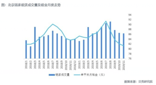 贝壳研究院的数据显示,北京租赁市场自9月份开启传统淡季回落模式后,成交量持续回落,11 月北京链家租赁成交量环比下降 1.9%,这是成交量的三连降。同时,11月北京月租金水平经历四连跌后跌至 81.3 元/平,环比下跌 1%,同比下跌 2.8%。与去年租赁市场淡季相比,今年租金下跌幅度更大,且当前租金水平已降至 2018 年年初以来的最低位置。