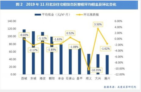 据我爱我家研究院统计,11月北京住房租赁市场交易量环比10月下滑7.79%,同比2018年11月下滑3.88%。1-11月的总交易量较2018年同期下滑2.70%。11月整租的平米租金为89.82元/㎡·月,环比下跌0.84%;整租套均租金为5843元/套·月,环比下跌1.04%。因进入淡季,11月北京租赁市场继续萎缩,平均租金稳中微跌,降至90元/㎡/月以下。其中,石景山、大兴租金微涨,其他各区普降。