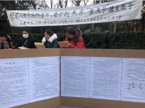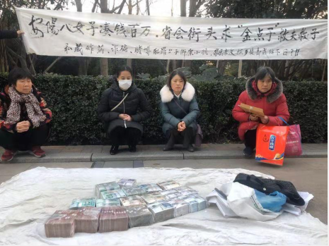 她们身后的一个横幅上写着“安阳八女子凑钱百万,省会街头求‘金点子’救夫救子”字样,并表明“不管是谁,只要有办法救了她们的丈夫和儿子,100万现金直接兑现”。8名女子情绪激动,见有人靠近询问,抑制不住内心的痛苦,气得直掉眼泪。