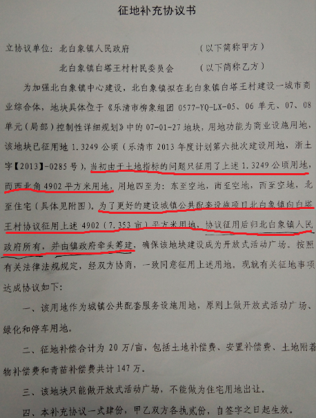 村民王志璋向本网记者讲述:乐清百佳商场是在2014年由北白象镇人民政府实施征收,白塔王村民委员会配合落实征地补偿,根据2014年7月3日北白象镇人民政府和白塔王村村委会签订的北白象镇白塔王村商业综合体项目建议意见书内容标明:位于百佳商场西北角的4902平方米白塔王村集体土地并不在乐清市2013年度计划第六批次建设用地的征收范围,另据乐清市国土资源局调查认定,该4902平方米约合7.353亩土地属于白塔王村集体土地,现状为农田和旱地。令村民惊讶的是,在一份镇政府与村委会签订的征地补充协议书中,该地块被乐清市北白象镇人民政府无故征收,政府补偿款20万/亩也低的离谱,全体村民也并不知情?