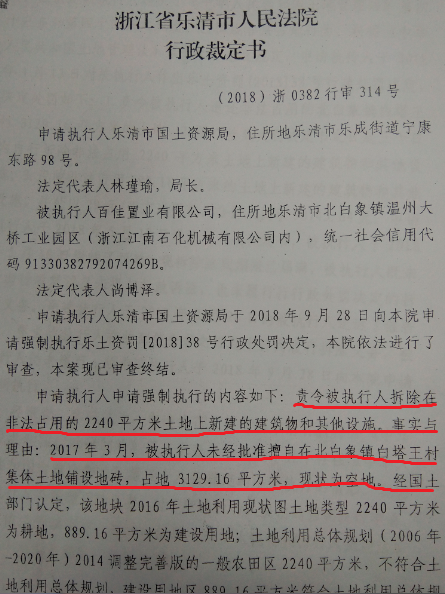 根据北白象镇白塔王村村民提供的资料显示,乐清市囯土资源局2018年4月13日下达的乐土资罚(2018)38号行政处罚决定书事实与理由:2017年3月,乐清百佳置业有限公司未经批准擅自在北白象镇白塔王村集体土地上铺设地砖,占地3129.16平方米,现状为空地。经乐清市国土资源局部门认定,该地块2016年土地利用现状图土地类型2240平方米为耕地,889.16平方米为建设用地,土地利用总体规划(2006年-2020年)2014年调整完善版的一般农田区2240平方米,不符合土地利用总体规划。行政处罚决定如下: