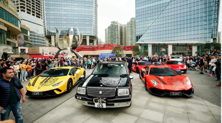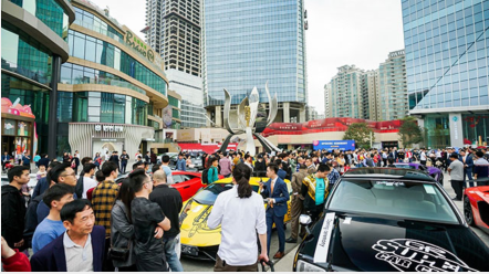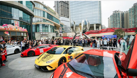 下午14:00开始,兰博基尼大牛、迈凯伦650、法拉利488、奔驰 SLS 、阿斯顿马丁 DBS 等40余台超跑陆续抵达国贸城白兰花广场,现场立马集聚了大量的群众围观合影。